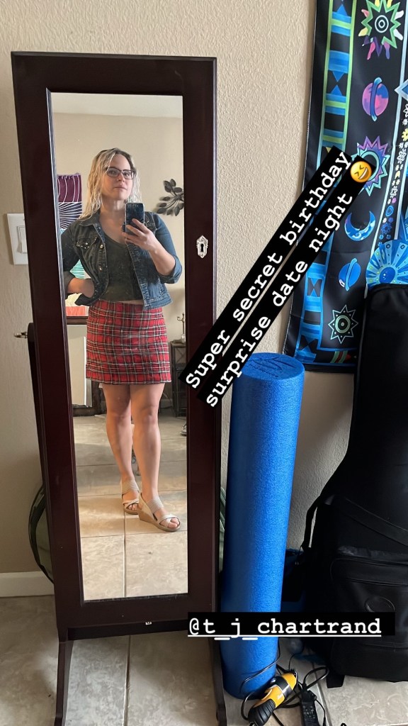 I did wake up just before they arrived back home. I jumped in the shower and went through my entire closet picking and choosing what to wear. Of course, when I want to look good nothing fits right or lays correctly and somehow, I got more bloated over night? But I finally settled on a plaid zip up skirt, green crop top and my jean jacket with my only pair of nice wedge sandles. Ty took one look at me and told me how beautiful I was. This made me smile. I asked him if this was appropriate for the evening’s activities, since I was still in the dark about what he had planned. He assured me it was and that I looked perfect. Ty always looks handsome, but when he dresses up for me, I feel so lucky. He wore a maroon long sleeved shirt and a pair of gray pants. Together we looked ready for a night downtown… whatever it was we were doing.
