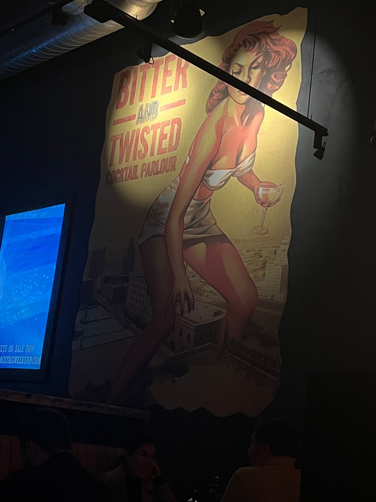 We made it to Bitter and Twisted and were seated pretty quickly. The decor was very Victorian meets 1920’s meets modern with the 20-foot velvet curtains behind the large red leather booths, the antique lighting and exposed brick on the bar. Our server, a gorgeous dark-haired woman with red lipstick and pink glitter on her eyelids, gave us a guided tour of their extensive cocktail menu. Although, I didn’t like how much attention she paid to Ty, I just snaked my arm through his and sat very closely. Ty said it was all in my head, but I couldn’t blame her for checking him out. He was handsome. I was checking him out too.